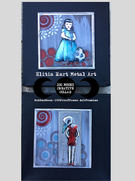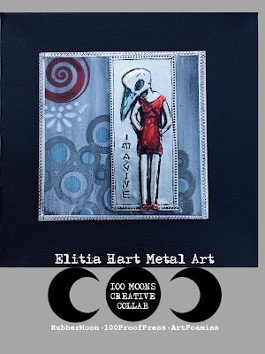 I am Elitia Hart, metal art instructor and mixed media explorer, and this is my first post for the 100 Moons Creative Collaboration blog. I almost always use some form of metal sheet in my projects and am so excited for the opportunity to incorporate Artfoamies, 100 Proof Press Rubber Stamps and Rubbermoon stamps into my work.