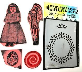 I used the Rubbermoon Kae Pea Doily Stencil ATC Size with Dreamweaver Stencils Metallic Silver Embossing Paste to surround the spiral. Once the embossing paste is dry you could apply another coat of satin Rustoleum Lacquer.