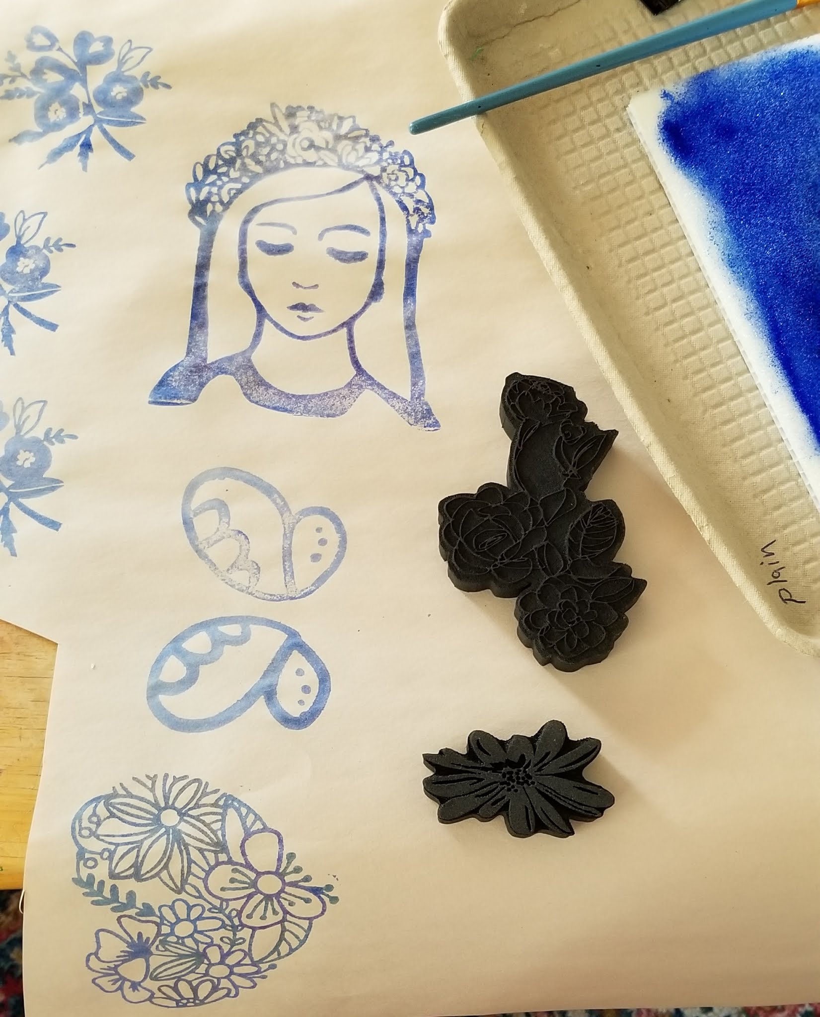 To begin this project I stamped my images onto newsprint and cut them out so I could play with the design and placement on the jacket.