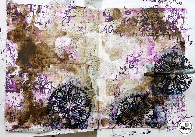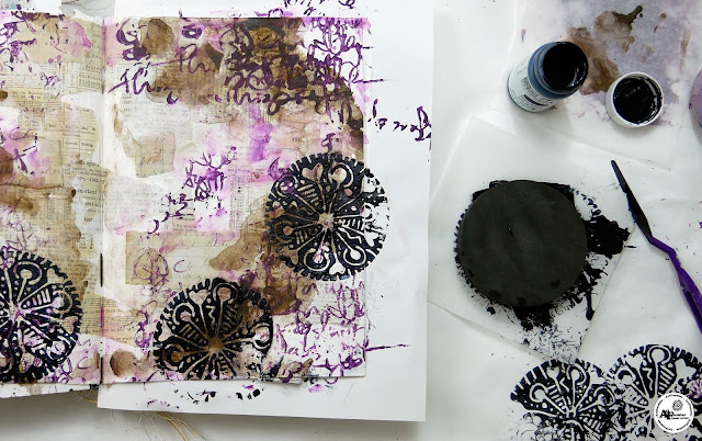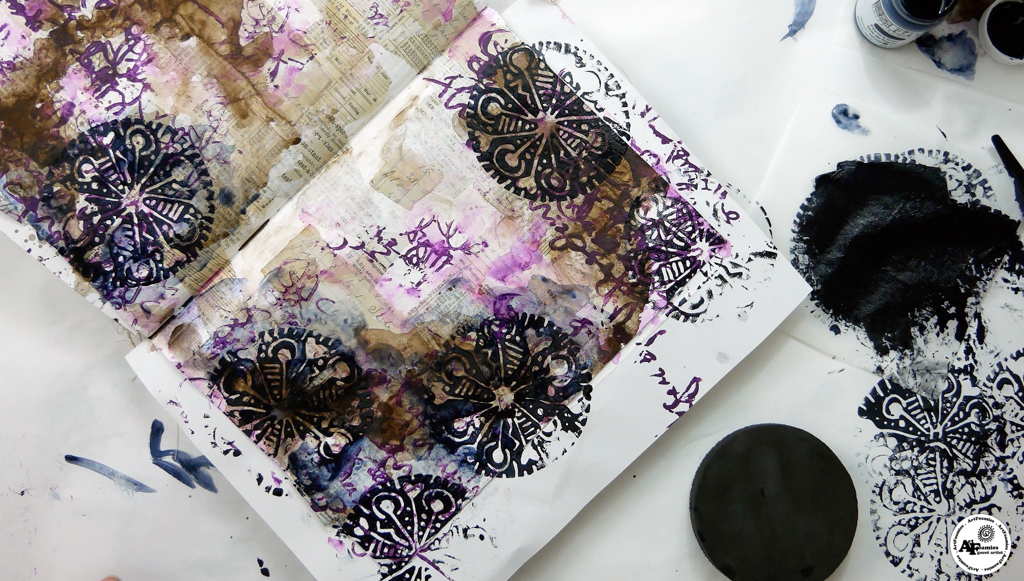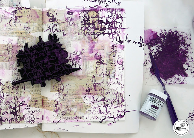 Next, it was time to start the ArtFoamies layering! I grabbed the large Writer’s Block stamp and stamped it mainly around the edge of the journal pages using Golden’s new So Flat paint in Red Violet. I used a palette knife to spread paint across the Foamie and also used a piece of patty paper as a temporary ink pad. Using both methods will give you different stamp results with thicker, thinner, lighter or darker strokes, which will all add interest to your background. Don’t worry too much about how this layer looks. If you don’t have even stamping or perfect lines, there will be many more layers on top. While there was still wet paint on my patty paper, I sprayed it with a little water to make it thinner and spread it loosely a few places between the stamps, again to add interest.