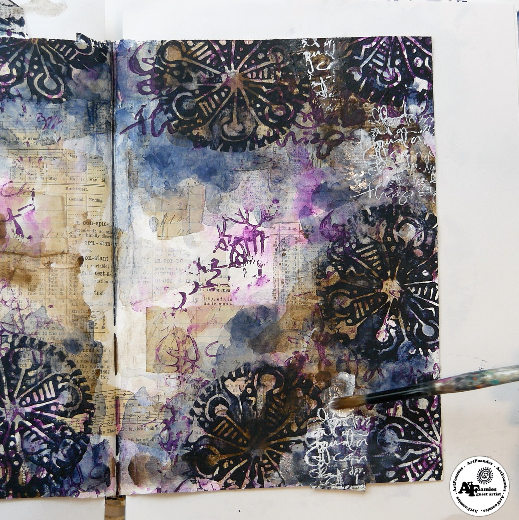 Then it was time for the next ArtFoamies layer! I picked up the Candy Love stamp, and using the same technique with the patty paper/palette knife, I stamped it several places on my pages with Golden So Flat Payne’s Gray. To create the watery/cloudy effect around the stamps, I used my paintbrush in some water while the stamped image was still wet to blur the edges and picked up some paint as needed from my palette. For this process I worked in stages, stamping a few at a time and softening them. As the stamped images dried, I continued to soften them in places, removing paint so they looked a little aged or more like watercolor. (This process might be a little easier to understand when you watch the video!)