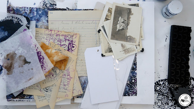 With my background finished and drying, it was time to figure out what to do next. Often it is so hard to cover up a background, isn’t it? I pulled out a bunch of vintage photos, some tags, the dried palette papers, book pages I’d stamped the Foamies off on, and some rust-dyed fabric an artist friend gave me
