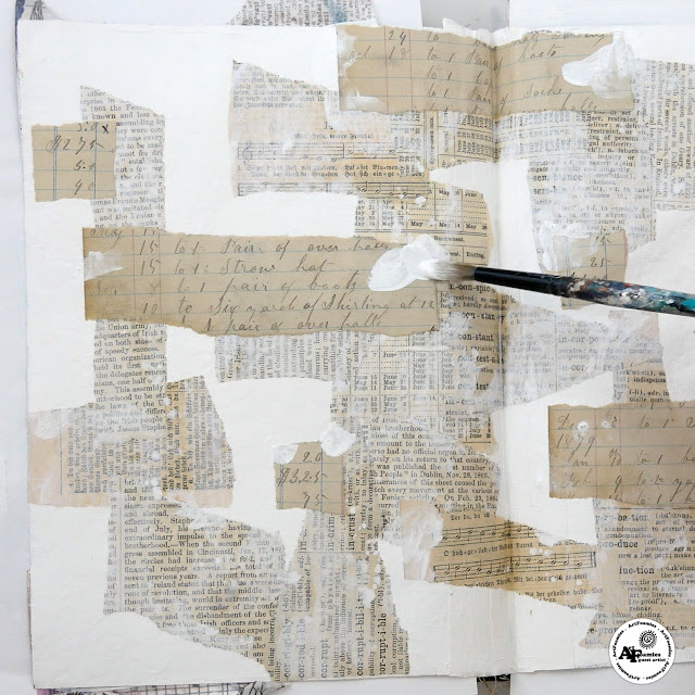 First, I stuck down a bunch of book text and dictionary pages with matte medium. Once dry, I embedded these pages a bit with gesso. This gesso layer adds so much interest, it’s amazing! Once that gesso was dry, I realized I didn’t use any of my favorite handwritten ledger pages. So, I grabbed one of those and added a few pieces, again topping with some gesso. One thing that draws me to mixed media is the combination of mediums, layers and “what ifs” that fill the page or canvas. The gesso often helps to create those happy accidents.