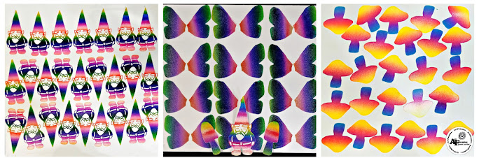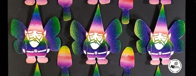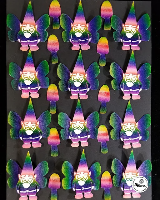 I wanted the Gnomes to have fairy wings so they could fly & a variety of mushrooms to play on. - I inked & stamped a sheet of Kae Pea's smaller GNOMELY gnomes.