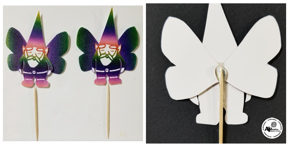 Next I used my hot glue gun & glue sticks to attach the wings to the Gnome's bodies. I then hot glued a wooden tooth pick to the back of the flying Gnome.
