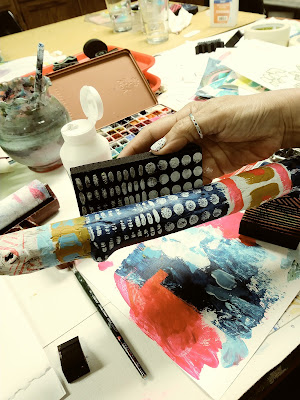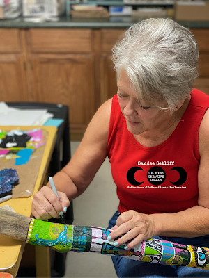 Here's a picture of Kae Pea putting some of her creative genius to work designing the art for her stick with some Art Foamies, which were terrific for stamping onto the round uneven surfaces.
