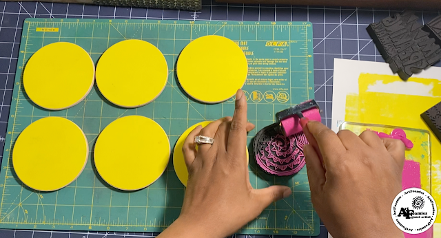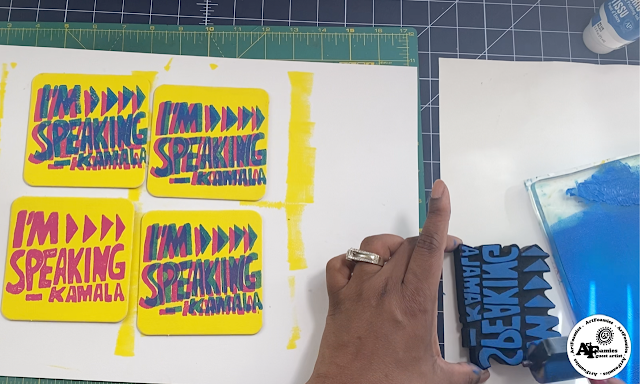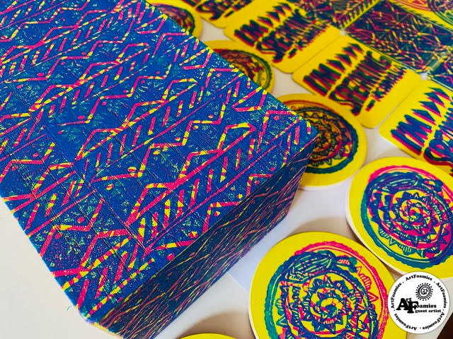 And then I used the Snail, I’m Speaking, A Dash of Spice, Over The Rainbow, & Fireworks ArtFoamies to print on the coasters and wooden box with the Magenta & Blue inks. I left it on my drying rack aka dining room table for 24 hours to dry.