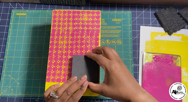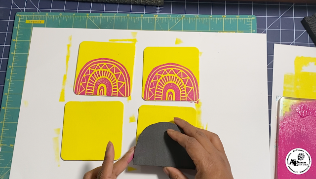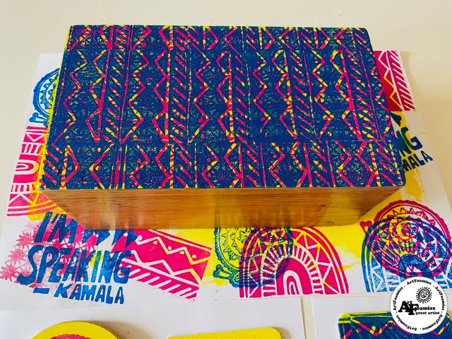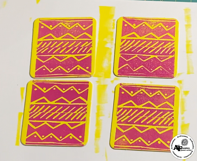 I also pulled out a brayer and my gel press to print all three colors. I started with yellow and rolled the ink directly on paper/ceramic coasters and a wooden box.