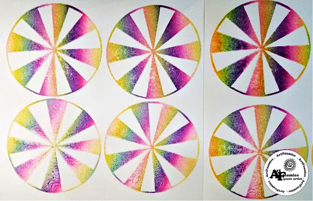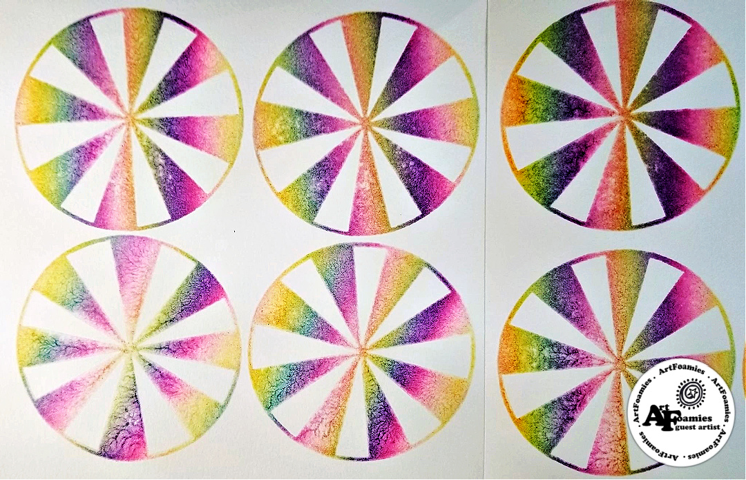 Kae Pea's PINWHEEL ArtFoamie was at my left hand so I stamped a few sheets of the pinwheels on 140 pound hot press watercolor paper using 2 of my different custom inked StampBuddy foam stamp pads. One was inked with MoonGlo Neon Brights & one was inked with the beautiful Moonlight Duo colors.
