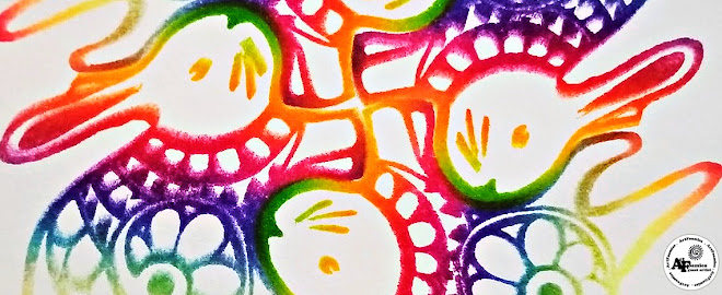This creation began as I was playing with Marta Harvey's BUNNY WITH SWEATER TESSELLATION ArtFoamies foam stamp. This was my first time using it. I think it is adorable! This bunny is also available without a sweater if you wish. Marta's tessellation ArtFoamies are so fun & fascinating to play with! I have a ball with them! Have you tried them? They fit together like puzzle pieces in many different directional patterns. I chose to stamp these in a spiral dance pattern onto 140 pound hot press watercolor paper.