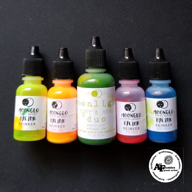 I love creating custom inked ArtFoamies StampBuddies & ScrapBuddies with The Moon & The Maker Moonlight Duo Tint & Hue Re-inkers & MoonGlo re-inkers. This is how I create the colorful ombre & rainbow stamping effects with my ArtFoamies. I also love to use the Moonlight Duo Tint & Hue Ink pads if I want solid color stamping.